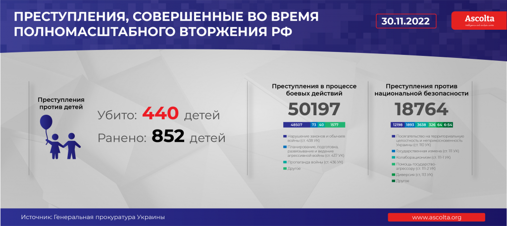 Более 1292 детей пострадали в Украине в результате полномасштабной вооруженной агрессии Российской Федерации. По состоянию на утро 30 ноября 2022 года официальное число детей-жертв не изменилось – 440. Выросло количество раненых – 852.