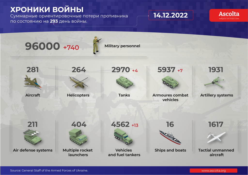 Согласно информации Генерального штаба Вооруженных сил Украины, в течение дня 13 декабря Силы обороны Украины отразили атаки российских оккупантов в районе Гряниковки (Харьковская область); Новоселовское, Червонопоповка, Серебрянское, Белогоровка (Луганская область), Белогоровка, Соледар, Бахмутское, Бахмут, Курдюмовка, Невельское, Марьинка, Победа, Новомихайловка (Донецкая область).