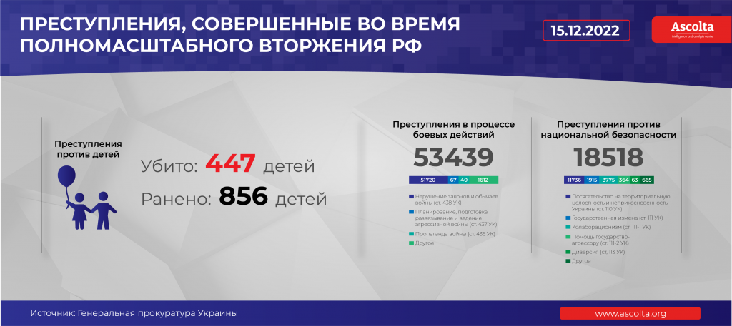 Более 1298 детей пострадали в Украине в результате полномасштабной вооруженной агрессии Российской Федерации. По состоянию на утро 14 декабря 2022 года официальное число детей-жертв за сутки не изменилось — 443. Не изменились и данные относительно раненых — 855.