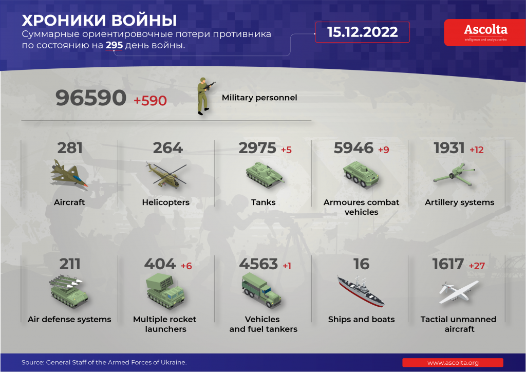 Согласно информации Генерального штаба Вооруженных сил Украины, противник продолжает сосредоточивать свои усилия на наступательных оперативных действиях на Бахмутско-авдеевском направлении. Оккупанты пытаются улучшить свое тактическое положение на Купянском, Лиманском и Запорожском направлениях. На других направлениях противник пытается сковать Силы обороны Украины.