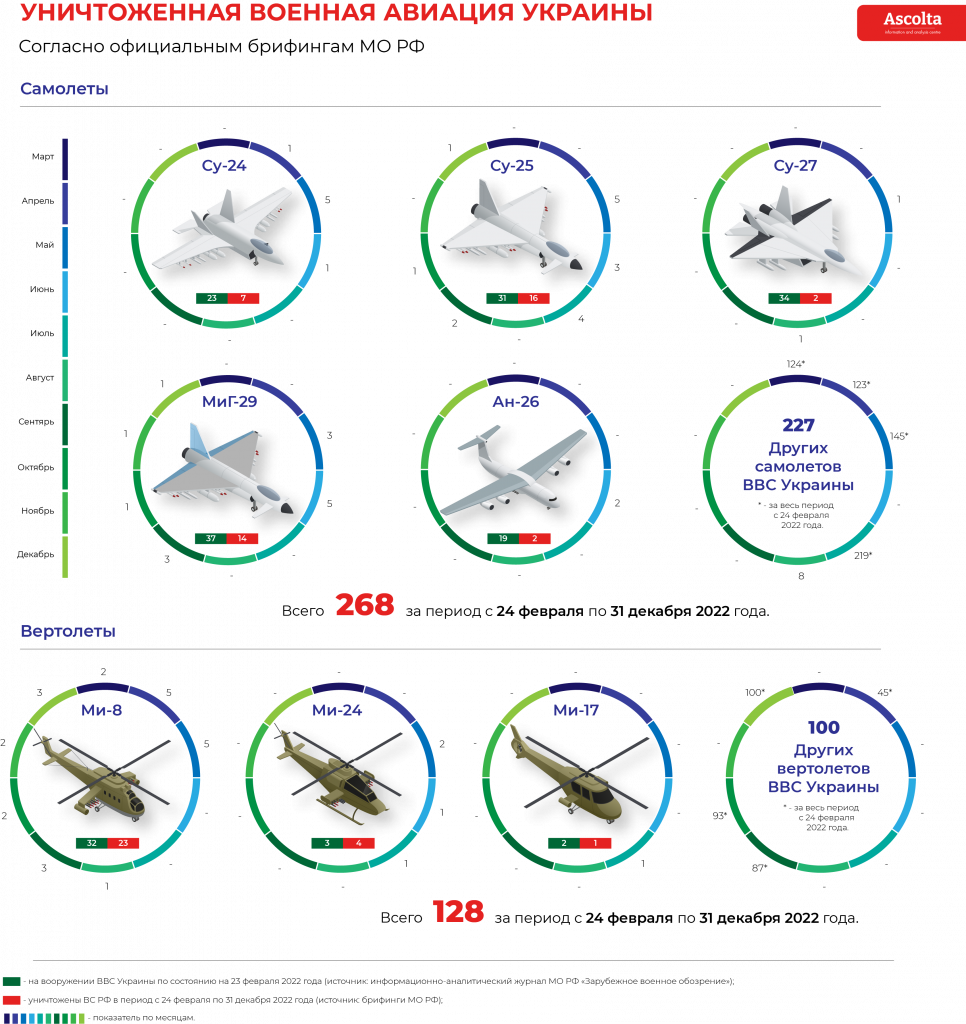 Согласно данным, озвученным Игорем Конашенковым на брифингах МО РФ, за период с 24 февраля по 31 декабря было уничтожено 268 украинских боевых самолетов, а также 128 вертолетов. Интересно, что согласно открытым данным, общее количество боевых самолетов всех типов, состоящих на вооружении украинской армии (по состоянию на 23 февраля 2022 года), составляет 193 единицы.