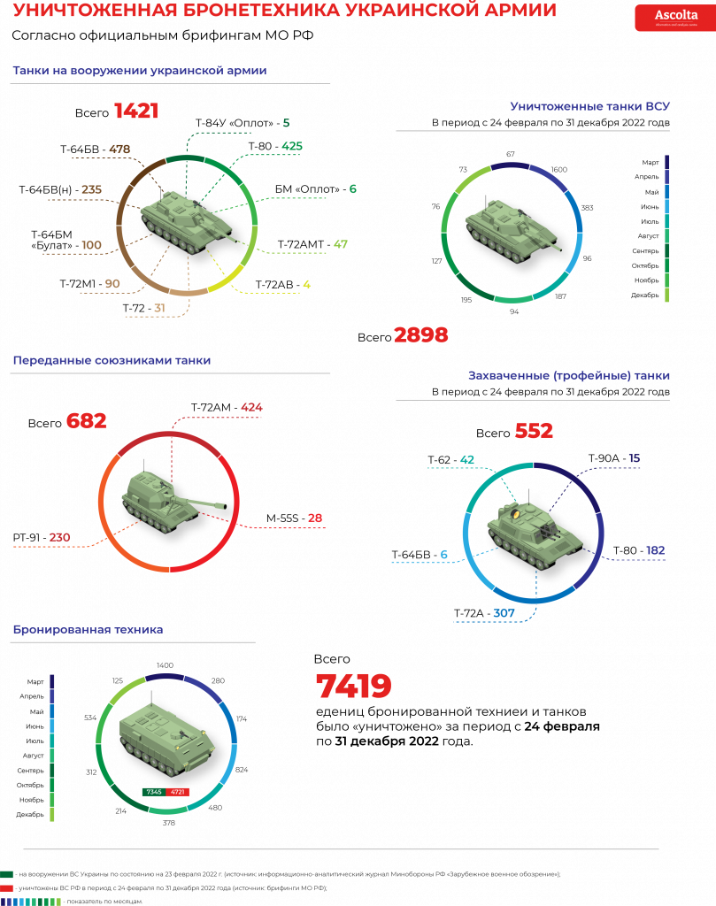 Согласно заявлениям МО РФ, колоссальные потери украинская сторона несет и среди бронетехники. В первую очередь речь идет о танках, которых, по состоянию на 31 декабря 2022 года было «уничтожено» даже больше, чем находилось в распоряжении украинской армии до начала войны – 2898 (согласно открытым данным, Украина имела 1421 танк, по состоянию на 23 февраля 2022 года).