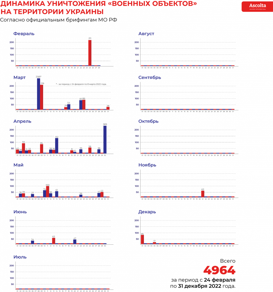 По состоянию на 31 декабря 2022 года, количество уничтоженных «военных объектов» на территории Украины составило 4964.