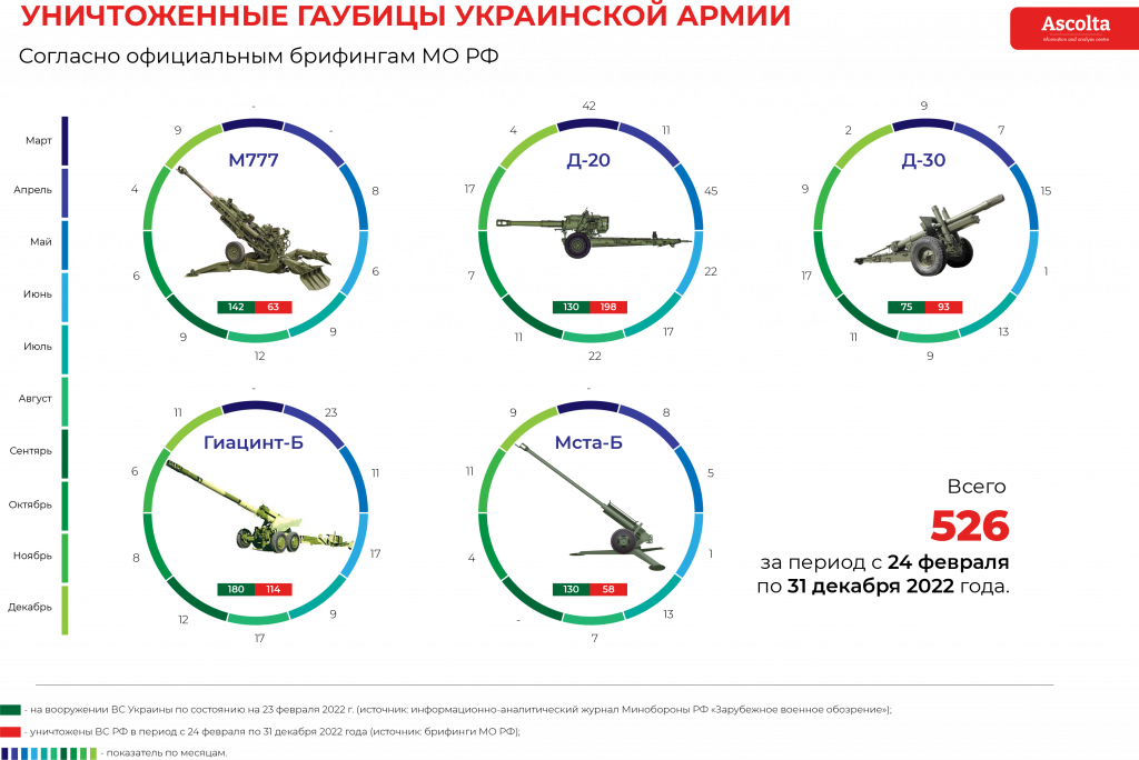Кроме американских гаубиц, российские войска активно «уничтожают» и советские аналоги, состоящие на вооружении украинской армии. Среди наиболее упоминаемых в брифингах МО РФ гаубиц стоит выделить «Гиацинт-Б», «Д-20» («уничтожено» на 68 больше, чем имеется на вооружении ВС Украины) и «Д-30» («уничтожено» на 18 больше, чем имеется на вооружении ВС Украины), а также «Мста-Б». В общей сложности Игорь Конашенков заявил об уничтожении 526 гаубиц за время российско-украинской войны.