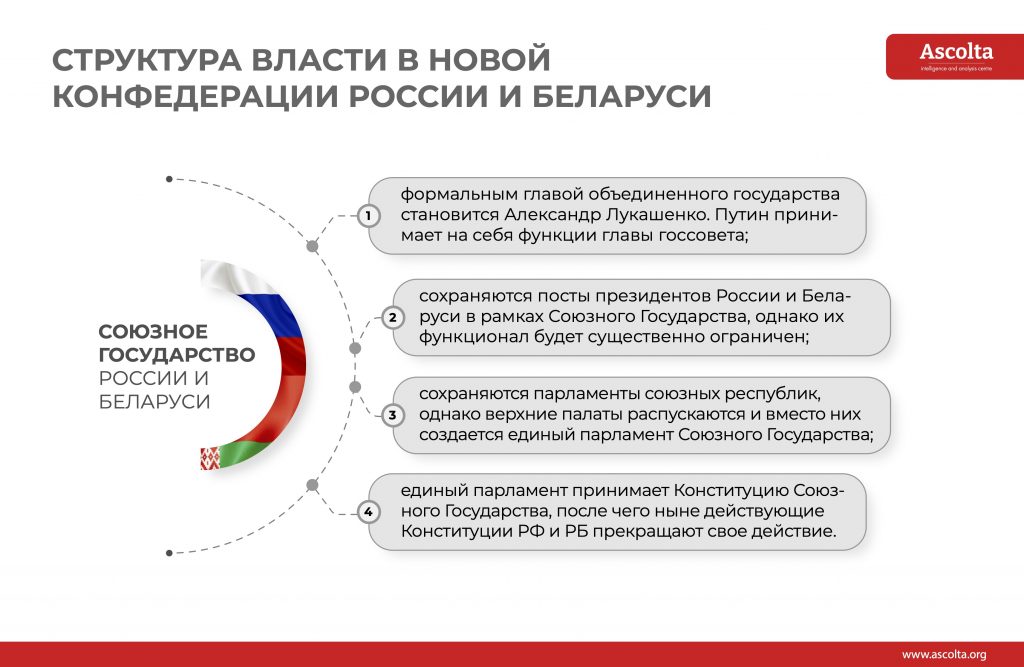 - формальным главой объединенного государства становится Александр Лукашенко. Путин принимает на себя функции главы госсовета;