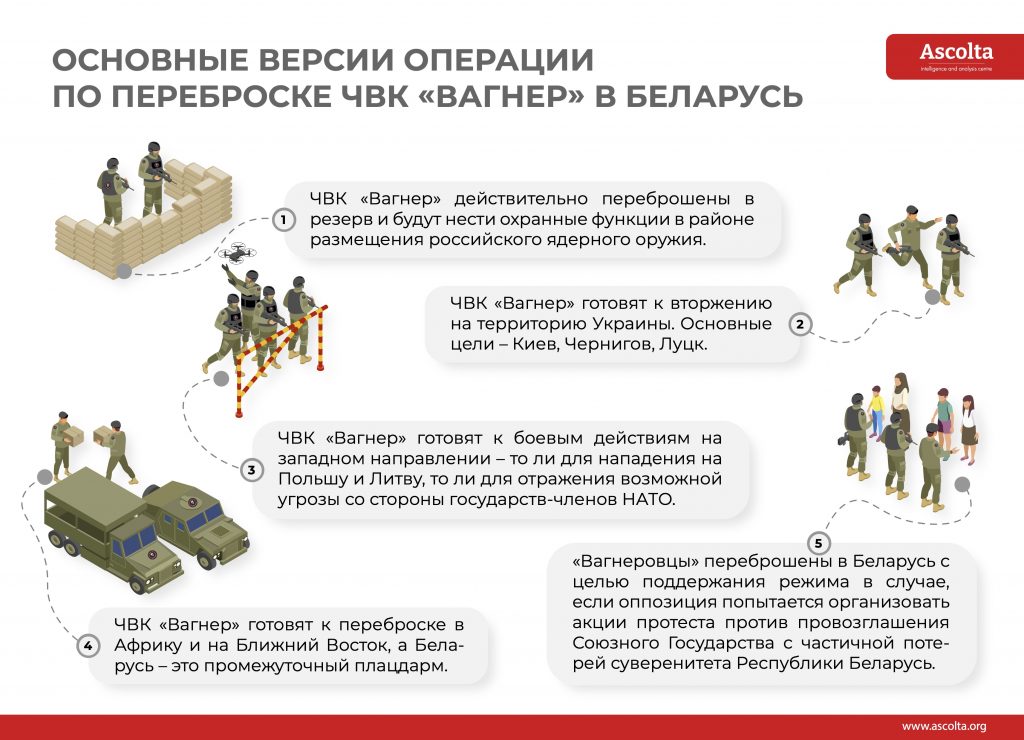 - Наконец, пятая версия: «Вагнеровцы» переброшены в Беларусь с целью поддержания режима в случае, если оппозиция попытается организовать акции протеста против провозглашения Союзного Государства с частичной потерей суверенитета Республики Беларусь. Согласно этой версии, в случае объявления о создании конфедеративного государства, белорусская оппозиция обратится к Польше и Литве с просьбой защитить конституционный строй в РБ. Поскольку эти государства не признают Лукашенко, а признали «законным президентом» Беларуси Светлану Тихановскую, теоретически существует возможность ввода регулярных или иррегулярных войск (прокси) на территорию Республики Беларусь под лозунгами «спасения независимости» и «передачи власти законному правительству».