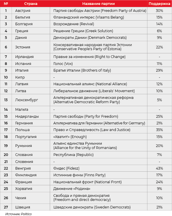 По состоянию на май 2024 года позиции политических сил, чья официальная идеология или публичные заявления и действия могут расцениваться как ультраправые в странах Европейского Союза, выглядят следующим образом: