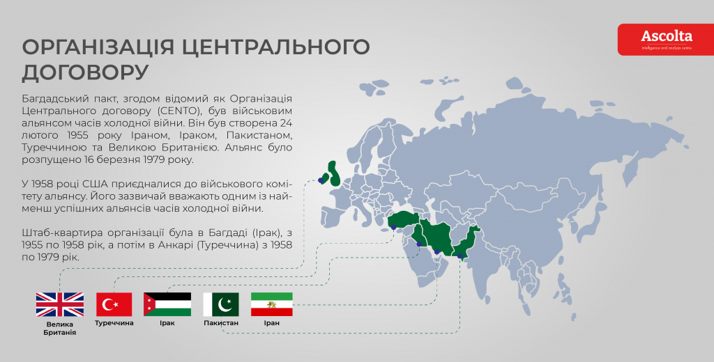 Після закінчення Другої світової війни в ситуацію втрутилися США, бажаючи посилити свій вплив у Близькосхідному регіоні та максимально знизити фактор впливу Радянського Союзу. У 1946 році Іран відмовив Москві в раніше обіцяній нафтовій концесії, а також розгромив прорадянських повстанців Іранського Азербайджану. Через дев’ять років під проводом США та Великобританії було укладено Багдадський пакт про створення Організації центрального договору (СЕНТО) – з ідеологічних міркувань абсолютно ворожої організації для СРСР.