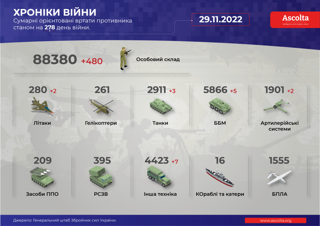 Згідно з інформацією Офісу Генеральної прокуратури України, станом на ранок 29 листопада офіційна кількість дітей-жертв за добу не змінилася – 440. Не змінилися і дані щодо поранених – 851. Ці цифри не остаточні, оскільки йде робота щодо їх встановлення у місцях ведення активних бойових дій, на тимчасово окупованих та звільнених територіях.