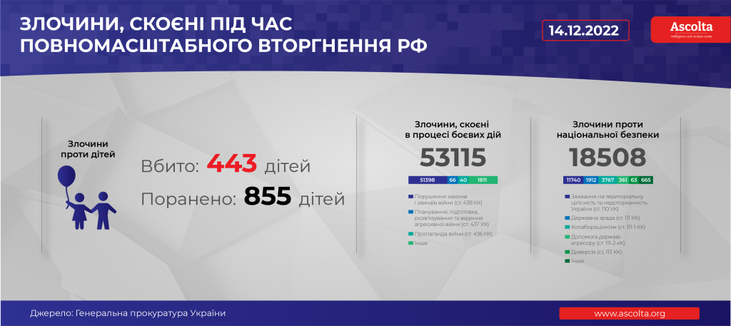 Понад 1298 дітей постраждали в Україні внаслідок повномасштабної збройної агресії Російської Федерації. Станом на ранок 13 грудня 2022 року офіційна кількість дітей-жертв за добу не змінилася – 443. Не змінилися і дані щодо поранених – 855.