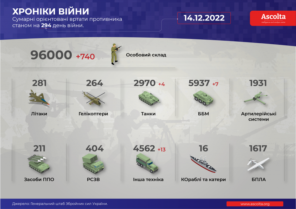 У ніч із 12 на 13 грудня в районі Новоайдара (Луганська область) загинуло понад 15 військовослужбовців Збройних сил Російської Федерації. У Запорізькій області втрати противника складають 100 поранених окупантів, знищено 1 склад боєприпасів.