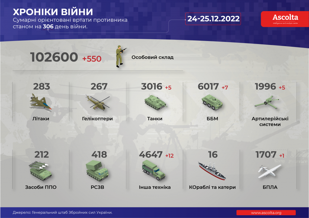 Противник продовжує зазнавати втрат. Так, за наявною інформацією, у місті Старобільську Луганської області днями до обладнаного окупантами військового госпіталю доставлено близько 50 важкопоранених військовослужбовців російських окупаційних військ. У місті Горлівка на Донеччині через відсутність донорської крові всіх працівників медичних закладів зобов’язали здавати кров за встановленим графіком.