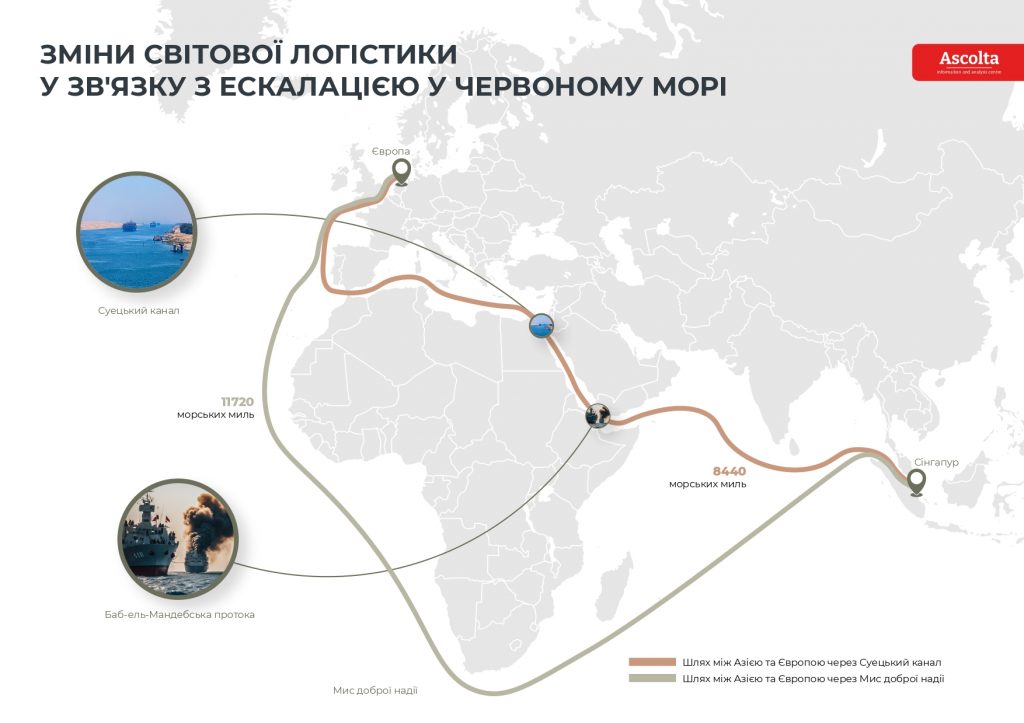 Після кількох місяців напруги в Червоному морі кілька великих вантажних компаній, включаючи «MSC» і «Maersk», почали змінювати звичні маршрути через Суецький канал і пускати судна в обхід Африки (даний маршрут на 8 тисяч кілометрів довший), додаючи витрати і затримки, які вже зараз провокують зростання світових цін на низку товарів.