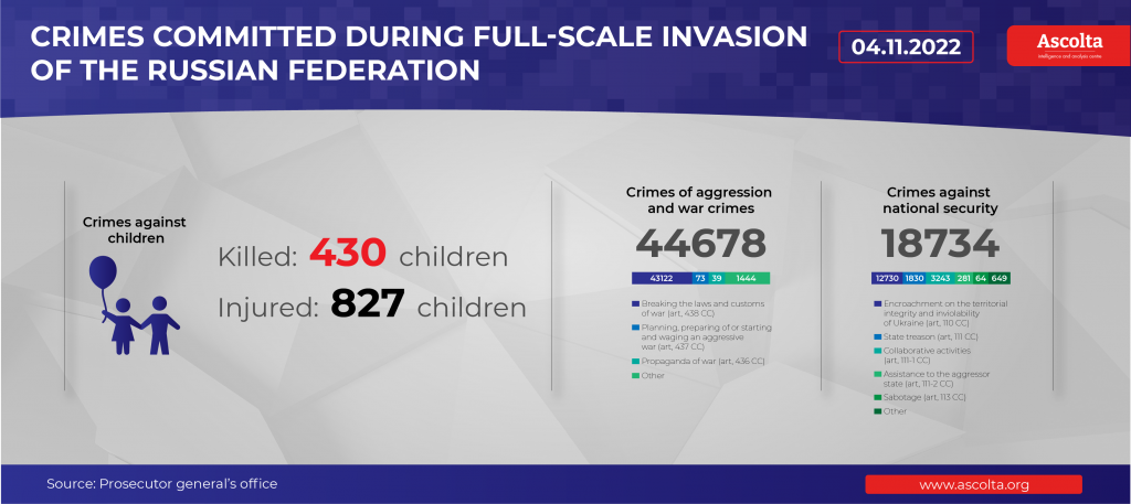 As of November 04, since the beginning of the Russian invasion of Ukraine, 430 children have died and more than 827 children have been injured. Due to the active hostilities in affected regions, there is no possibility to inspect the areas of shelling and destruction.
