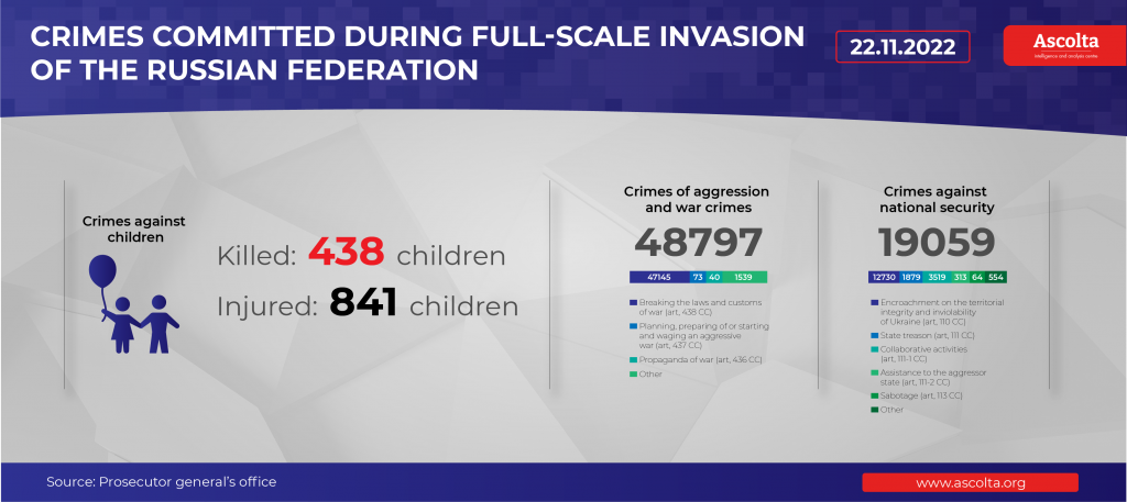 As of the morning of November 23, more than 1,279 children were injured in Ukraine as a result of the full-scale armed aggression of the Russian Federation. According to the official information of juvenile prosecutors, 438 children died and more than 841 were injured of various degrees of severity.