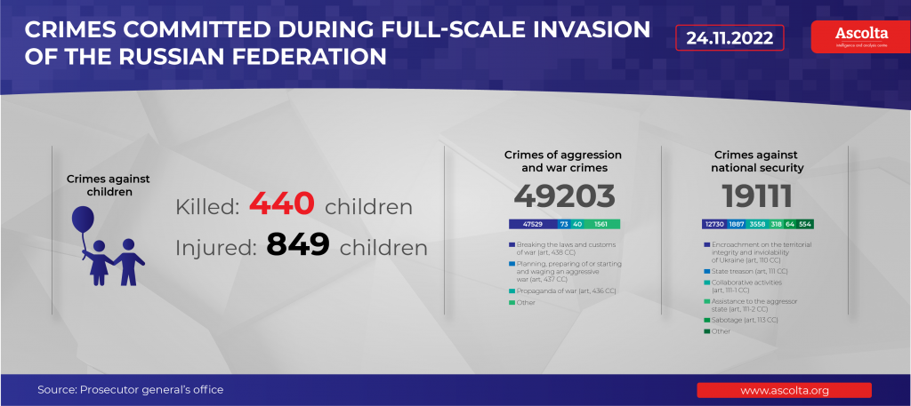 As of the morning of November 25, 2022, more than 1,287 children were injured in Ukraine as a result of the full-scale armed aggression of the Russian Federation. According to the official information of juvenile prosecutors, 440 children died and more than 849 were injured of various degrees of severity.