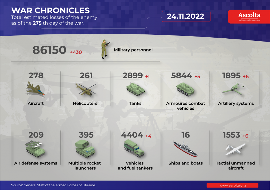 During the day of November 24, Ukrainian Air Force launched 12x air strikes on concentrations of enemy troops, weapons and military equipment; and 2x air strikes on russian anti-aircraft missile systems.