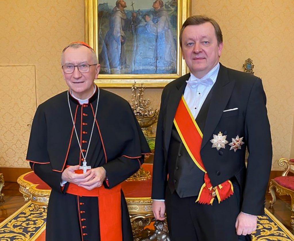 Shortly before the events of August 2020, during the presidential campaign of Lukashenko, Sergei Aleinik was summoned to Minsk and again appointed Deputy Minister of Foreign Affairs – again, while retaining the post of Ambassador Extraordinary and Plenipotentiary of the Republic of Belarus to the Holy See and the Sovereign Order of Malta. In February 2022, a few days before Russia’s invasion of Ukraine, Aleinik was appointed First Deputy Minister of Foreign Affairs. Minister Vladimir Makei reported to Lukashenko that Sergei Aleinik would be “responsible for Western Europe and America.” As a result, the diplomat, among other things, decided cases on Syria and accepted a letter of credence from the ambassador of Myanmar’s military junta. In mid-November, Aleinik also flew to Switzerland for negotiations. It is significant that on November 11, 2022, on the occasion of the 30th anniversary of diplomatic relations between Belarus and the Holy See, a solemn reception was held at the Apostolic Nunciature. In his welcoming speech, Sergei Aleinik, then First Deputy Minister, stressed: “The Vatican has always been and remains a reliable partner of the Republic of Belarus.”