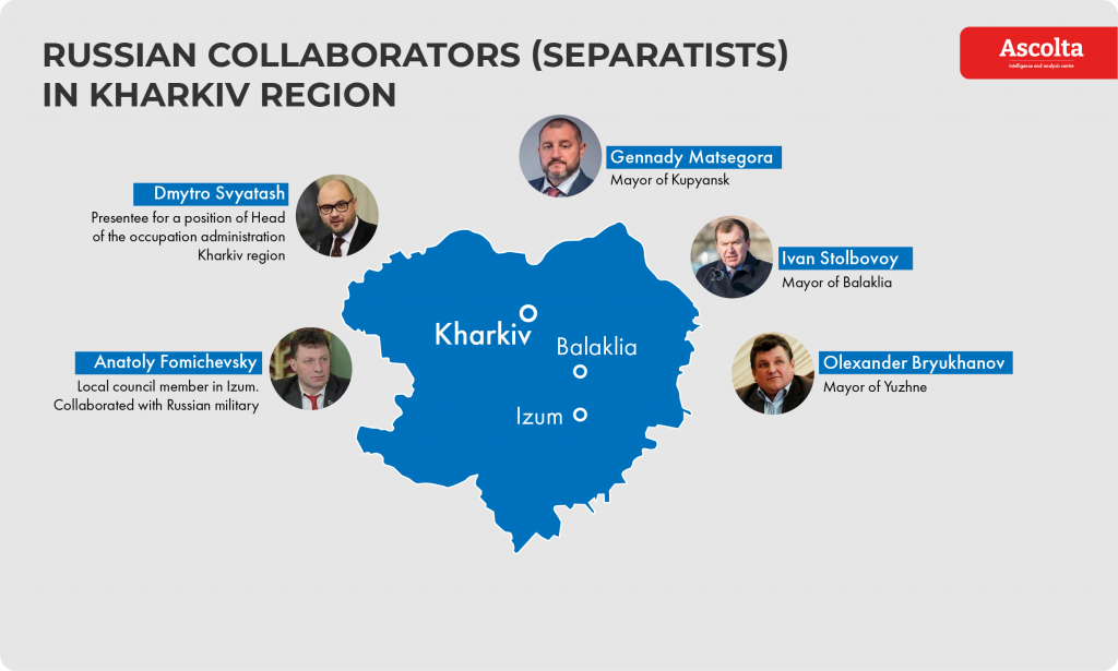The mayor of Kupyansk (Kharkiv region) Gennady Matsegora, went over to the side of Russia; later, he recorded a video message to Ukrainian President Volodymyr Zelensky about the kidnapping of his daughter by SBU officers and asked to release her. The head of Balakleya Ivan Stolbovoy went to cooperate with the Russian authorities. On February 28, 2022, Alexander Bryukhanov, the mayor of the Southern Kharkiv region, was detained on suspicion of high treason.