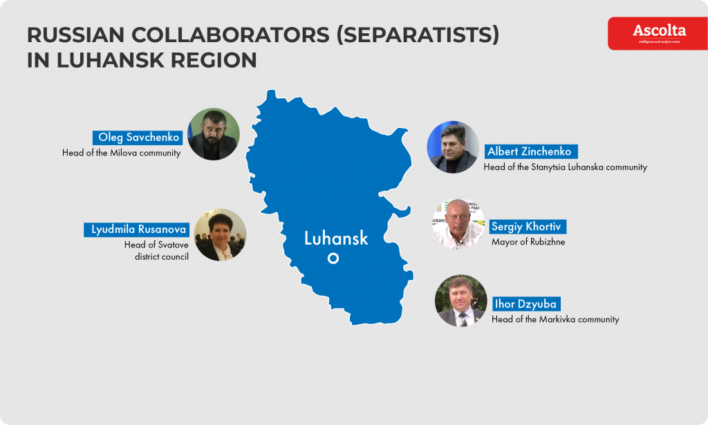 In the Luhansk region, the Russian military was supported by Albert Zinchenko, head of Stanytsia Luhanska village, Sergey Hortiv, head of Rubizhne, Igor Dzyuba, head of the Markov community, Oleg Savchenko, head of Melovoye village, and Lyudmila Rusanova, head of the Svatovsky district council.