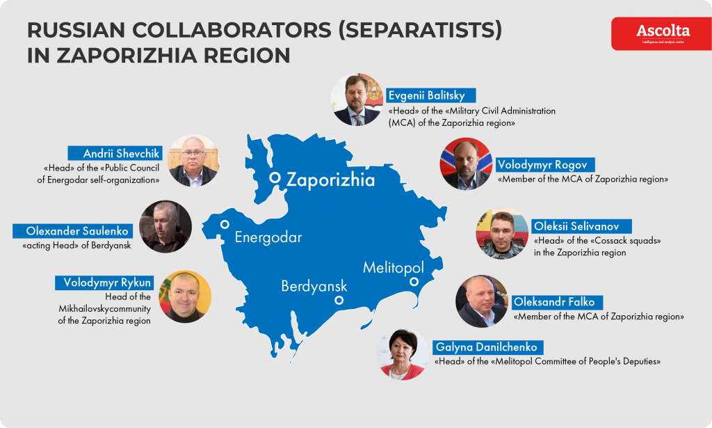 Being a native of Zaporizhia, Vladimir Rogov, who was living in Moscow since 2014, proclaimed himself as “a member of the military-civilian administration of the Zaporizhzhia region.” It was announced that “Cossack squads”, led by a native of Kyiv, Alexei Selivanov, who until 2014 worked in the Ministry of Defense of Ukraine appeared in the Zaporizhzhia region.