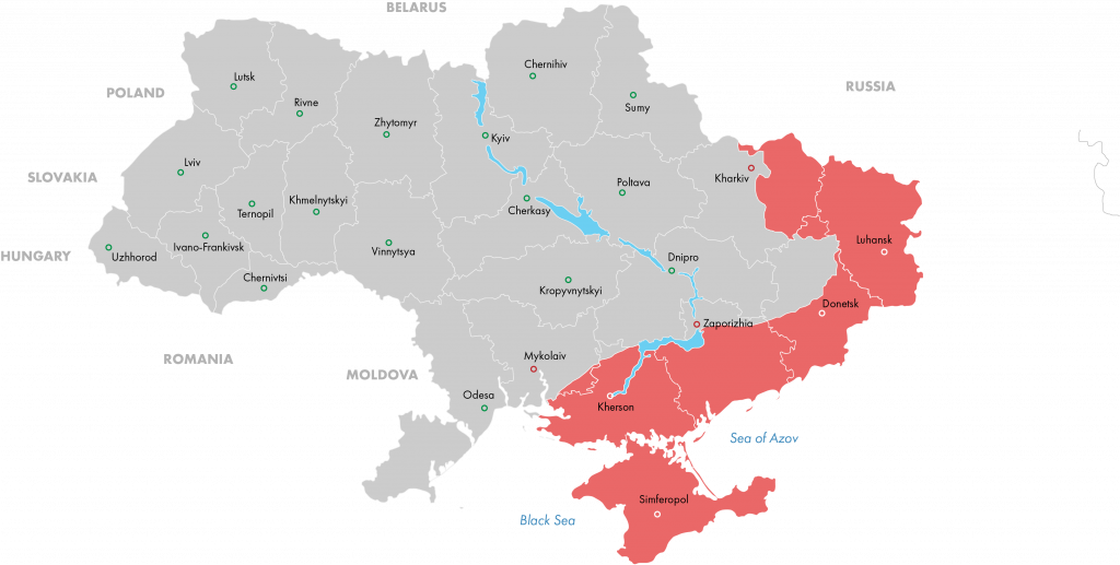 As of August 20, 2022, the Russian Federation controls about 20% of Ukrainian sovereign territories: the Autonomous Republic of Crimea and the Luhansk region (in full), most of the Kherson, Donetsk and Zaporizhzhia regions, and partially – the Kharkiv and Mykolaiv regions. Ukraine lost access to the Sea of Azov, control over the land route to Crimea and the mouth of the Dnieper. Communication with the Black Sea (except for specifically agreed options for the supply of grain to Turkey) is also problematized. The Ukrainian economy also suffered losses: metallurgical, machine-building, shipbuilding, coal, and agricultural enterprises were lost, and the number of sown areas in Ukraine in 2022 decreased by 23%. Although in his televised address on February 24, 2022, Vladimir Putin stated that the occupation of Ukrainian lands is not included in the plans of the Russian Federation.