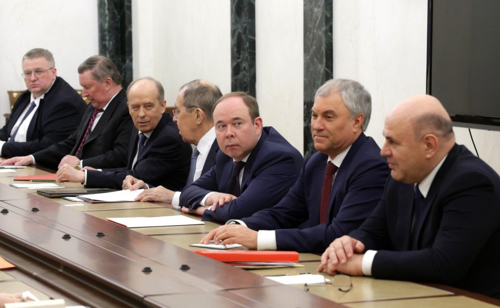 The meeting was attended by Prime Minister Mikhail Mishustin, Chairman of the Federation Council Valentina Matvienko, Chairman of the State Duma Vyacheslav Volodin, Deputy Chairman of the Security Council Dmitry Medvedev, Head of the Presidential Administration Anton Vaino, Secretary of the Security Council Nikolai Patrushev, Minister of Internal Affairs Vladimir Kolokoltsev, Minister of Foreign Affairs Sergei Lavrov, Defense Minister Sergei Shoigu, Director of the Federal Security Service Alexander Bortnikov, Director of the Foreign Intelligence Service Sergei Naryshkin, as well as Special Presidential Representative for Environmental Affairs, Ecology and Transport Sergei Ivanov.